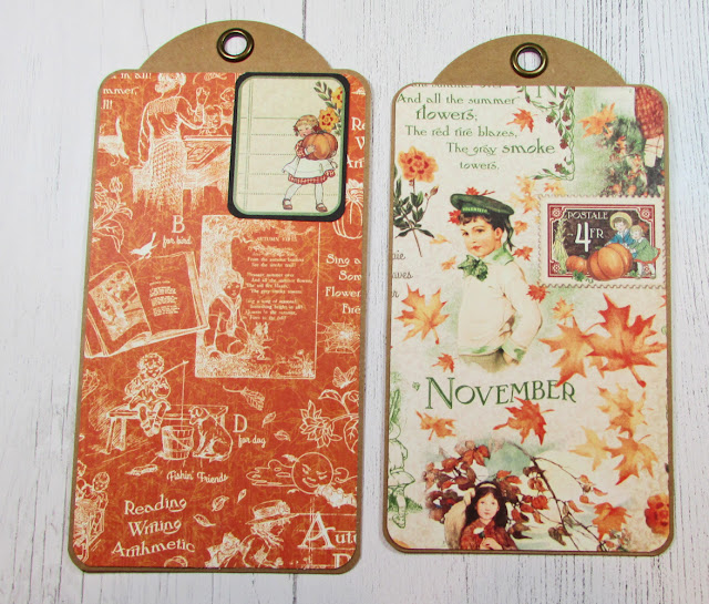 Flip the tags over. Trim Time to Flourish November Flourish paper to 6 7/8" x 3 3/4". Round all four corners and attach the paper to the back of the longer tag. Trim Seasons 12x12 Patterns and Solids (orange text) paper to 6 3/8" x 3 3/4". Round all four corners and attach the paper to the back of the shorter tag.
