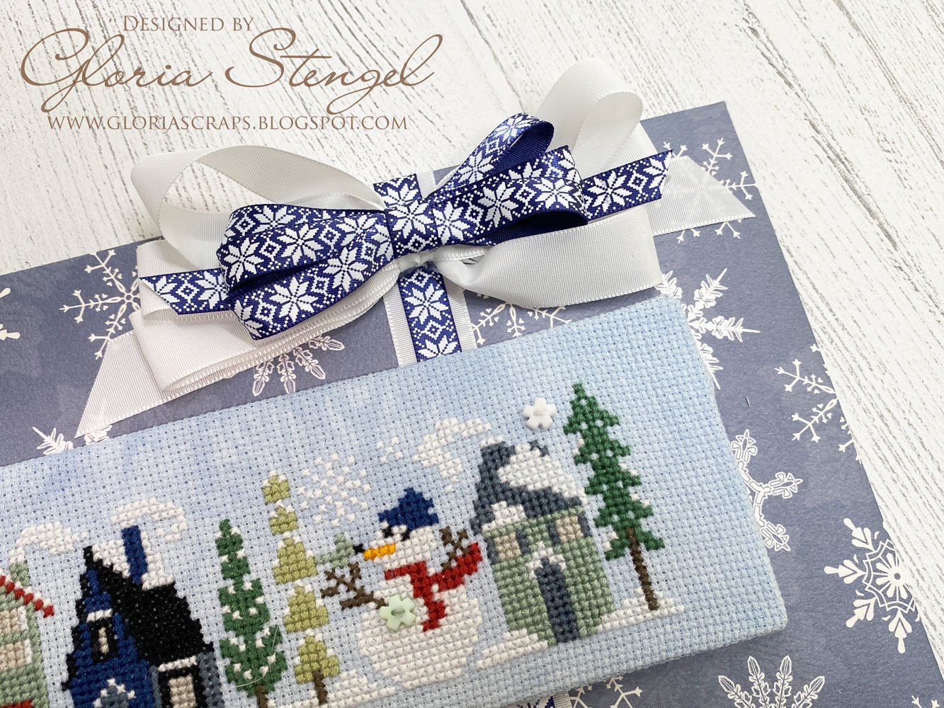 The finished stitching is approximately 9" x 3 1/4" and the full project is 11" x 5 1/4". The easel I made for the project stands up beautifully on a table or shelf, or on the top of on of my tiered trays. Currently it is sitting on my computer desk, giving my craft room some spring feeling during this gloomy, rainy day.